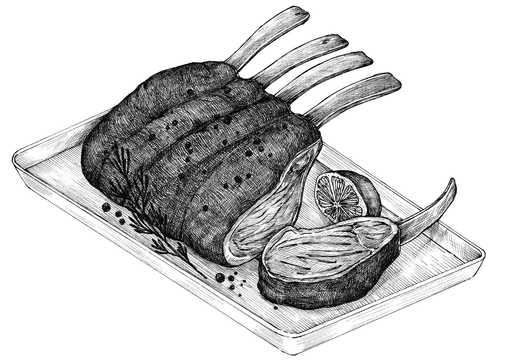 Souris d’agneau braisée au thym en basse température servie avec bouquetière de légumes et gratin, asperges, ris de veaux, etc.